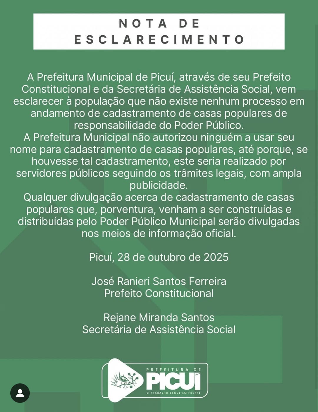 A Prefeitura Municipal de Picuí divulgou, nesta terça-feira (28), uma nota de esclarecimento informando à população que não existe nenhum processo de cadastramento de casas populares em andamento sob responsabilidade do Poder Público Municipal.
