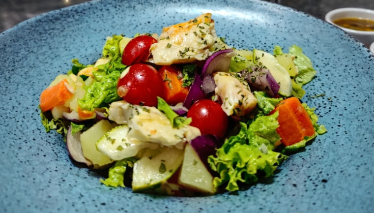 À primeira vista, o prato chama atenção pela composição colorida, fresca e sofisticada. Texturas bem definidas, cortes precisos e uma apresentação que foge do óbvio indicam que não se trata de algo comum no cardápio atual.